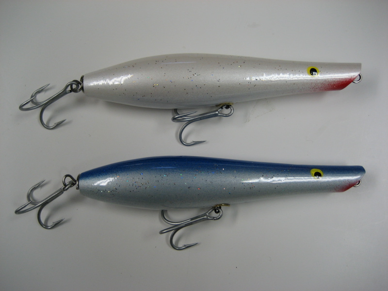 Dave, regarding the pencils, I don't think they are anything special. They're just an upsized version of a throw away (single hook) bluefish plug I made by the dozens when I was much younger. They're easy to work, with a lot of splash and short zigags, but for bass I find the slower gliding action of a 2 1/2 oz Gibbs very hard to beat (I think the Gibbs is one of the three best bass plugs ever built).