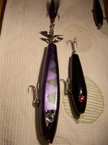 These are going to a show in Minnesota. The big one is 8 1/2" of wood with a couple of chopper props on the end. The nose is cupped out. Throws a good splash up front and churns like crazy from the a$$ end. Sits tails down, sharp twiches with the rod tip can make it slash left then right.