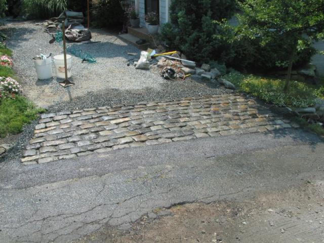 Cut out the ratty asphalt road and put in my own 10' X 16" patch using 600 pounds of Perma-Patch which worked really well. I had to set the stones back a foot so my neighbor wouldn't catch them when he plows in the winter. The transition from road to driveway now is so smooth