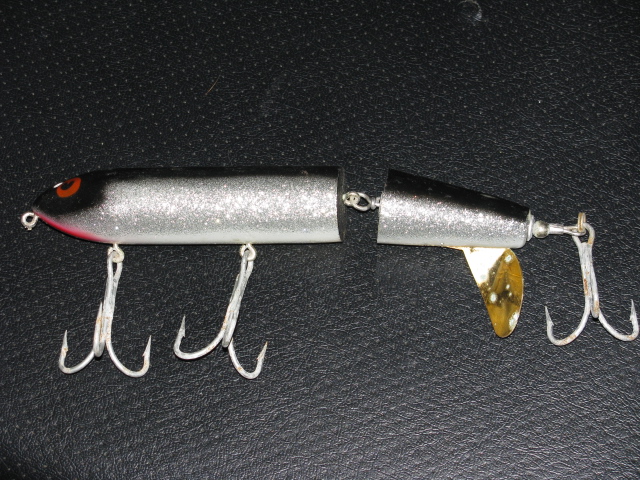 The one pictured is not mine. That one looks like it was made for musky with the two belly hooks. Several commercial manufacturers make one like it. Most use screw eyes in the front section. Mine are thru wired in both sections. Besides myself, only the Professor and #^^^^^^^^^^^& have one one of mine. Tail spins and kicks up the water. Move it like a dying bunker to slay the bass.