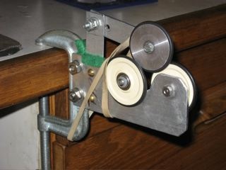 If you study how good roller setup is put together you'll notice that wing nutts allows to control tension, very important. The make-shifts I've seen where made from in-line roller skate wheels. Two wheels evenly spaced is where the blank sits and a separate top movable piece having one wheel sits on top of the blank, this piece has a groove and wing nutts so that its adjustable.
