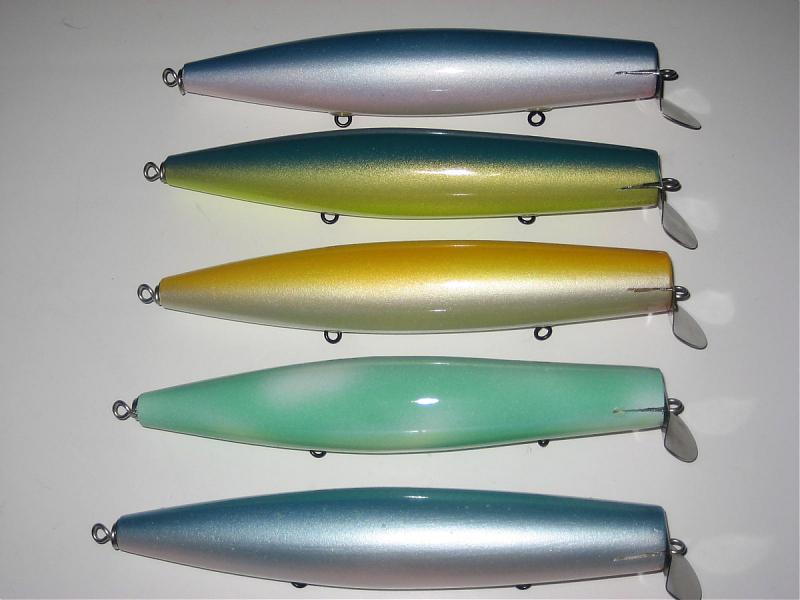 Knocked off his lineup of big (7.5") swimmers. Top is a Maple (3.8oz) then a Pine 3 oz and the last 3 surface swimmers (also 3 oz) . Each came out .2oz heavier than the original (2.85 oz Pine)....still unsure why. The body shapes are the same. The Maple is unweighted maple, the pine and surface swimmer are weighted pine. The Maple and Pine share the same high slot lip (which it turns out is nearly identical in size/shape to the NJ tackle large Pikie lip) the surface swimmer used a lower slot lip that was reportedly smaller (I don't have an original) so I used a mid slot lefty 2 for 2 plugs (which is what Musso used on his medium swimmers), and a Pikie 2 for the other (reshaped to lower the wire hole). Will swim them Thursday. Expect the Surface swimmers to stay up, the Pine to go medium, and the Maple to go deep.