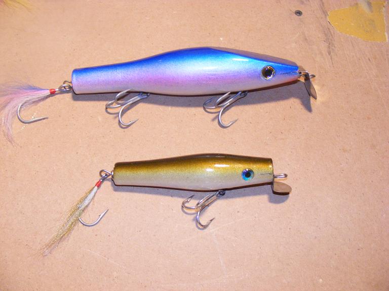 These are the first metal lips that we did. The top one is an 8" pine surfster. It weighs 2 3/4 oz. The bottom is a 5" pine danny that weighs 1 1/2 oz. Hope you like.
