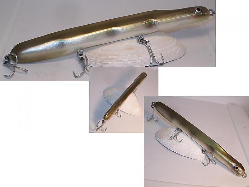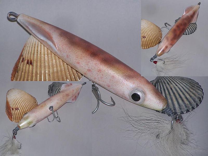 thanks fellas, eel is carved and then w/ some of the features added w/ 2 part PC wood and swims like a needlefish, squid features were added w/ PC and swims like a spook, sits just a little high in the water I think, I'm going to drill it's eyes out and add a little weight there w/lead shot to change the angle in the water slightly and help it along in the cast....it's looks great in the water and bumping through the suds, had a fish drill it when I was test casting it..