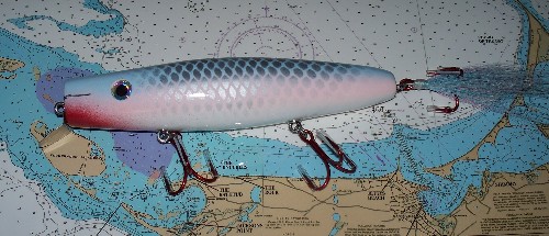 Here is another form the wood I was given, didn't want to wast it, so I did a BIG DANNY, He's 8" long an just about 2"round with 4/0 vmc hooks, weight in at 4.9oz dressed out.