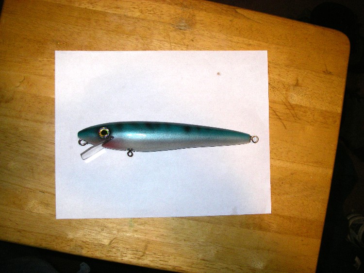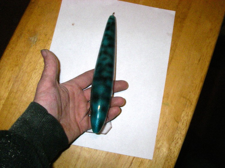 8.5" 3.25 oz hand carved mack. Red cedar and epoxy sealed. I hope it does well in the canal this spring.