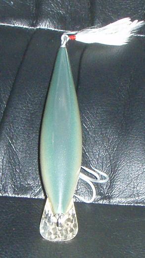 These are for Backbeach Jake. He challanged me to make one of my small spooks in any color I wanted. Did up a classic jiggy blue. Figured that wasn't much of a challange, so I did up a larger version, in a sort of olive mac color. Figured he is getting on in years, so I personalized it for him as a helpful reminder who he is