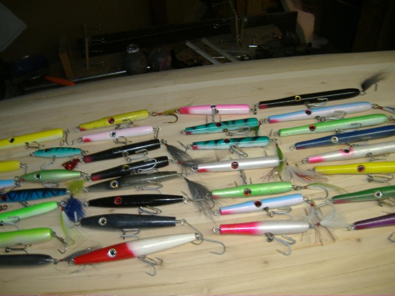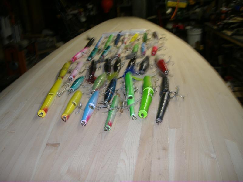 20 something needles. 4" to 9". 1 1/4 oz to 3 1/2 oz. most have vmc hooks. Some EnviroTex, others Du Pont A-7480S Acrylic clear. Some used and should have hooks replaced others never seen salt water. Test swam in fresh water only.