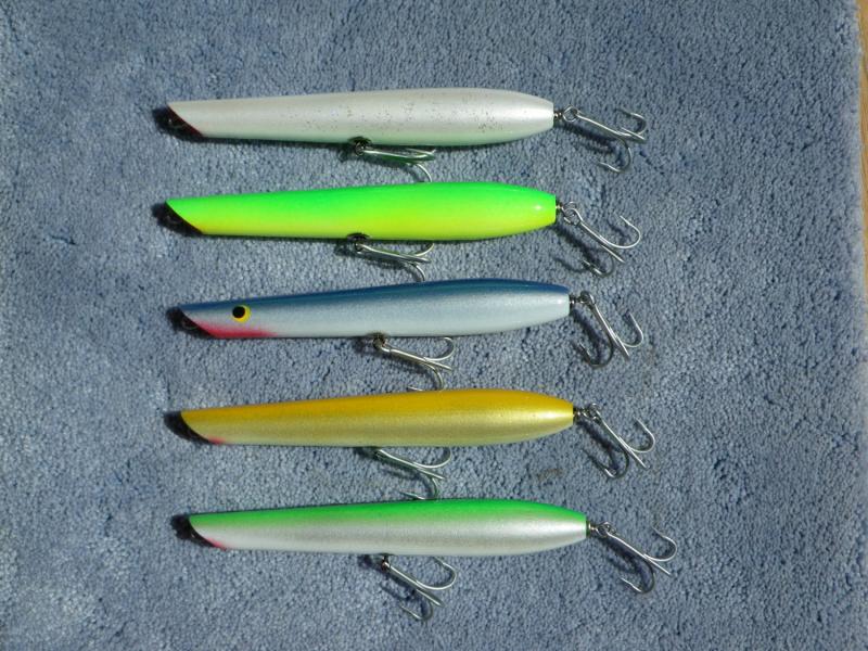 Small pencils. Based on Gibbs 6" 1 3/4oz. The left sided ones are standard. The right side ones are goosed to 2.9oz (lead both sides of the belly hook) to compete with Flap and his shiitty loaded tiny Cordells.