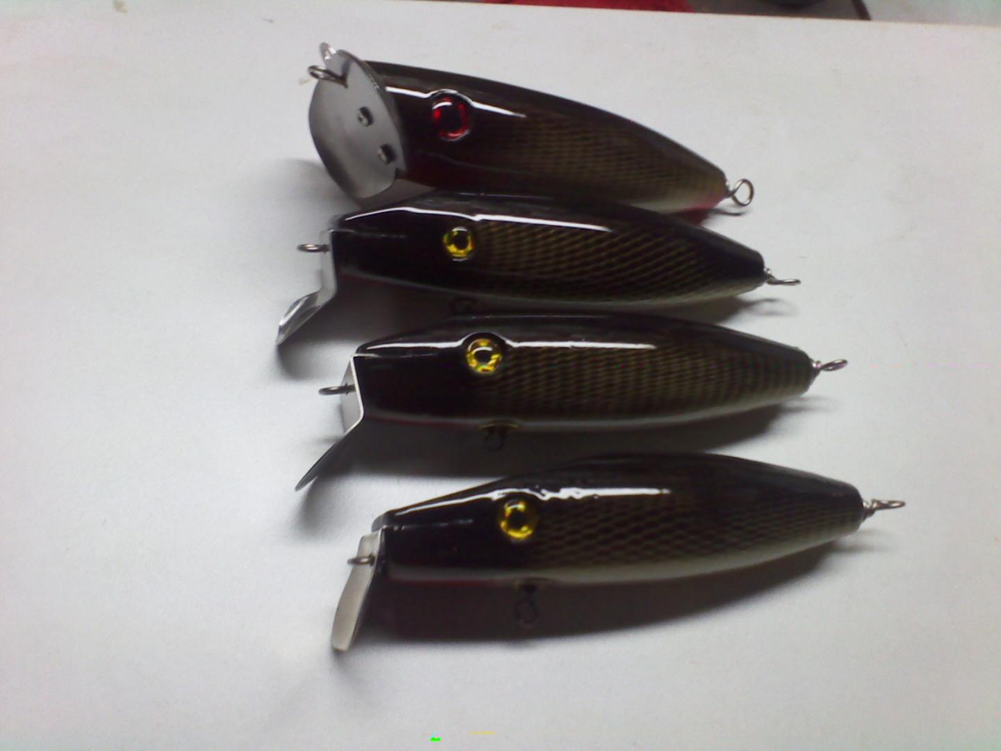 These are my Bunkaroos. Made from the same template with different designs. A big Jitterbug, Cowboy, Pikie, and Surfster. The Cowboy has an added 3 gram chin weight.