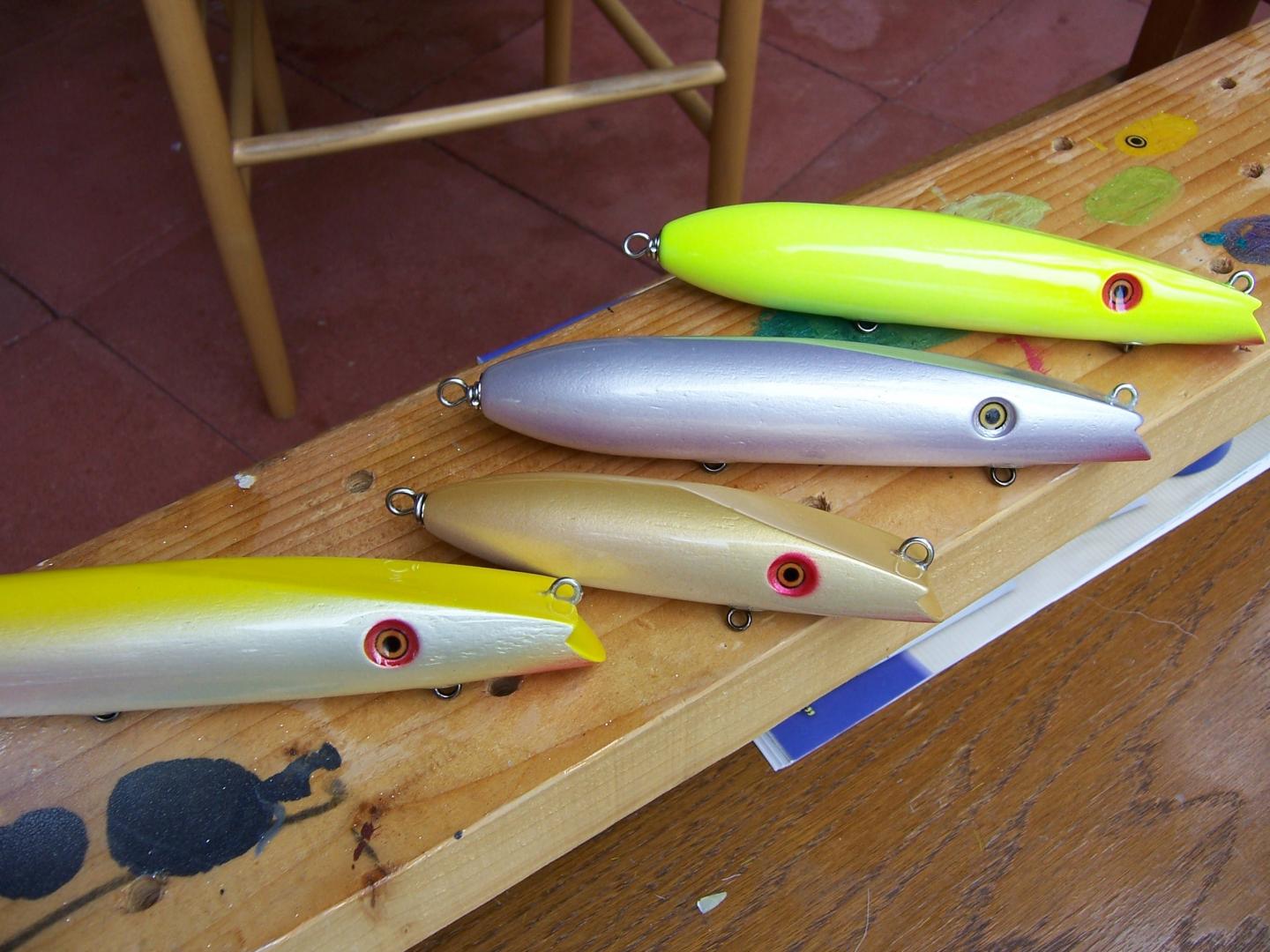 slow in here and I finally finished up a small amount of the tons of stuff i have in various stages. Here are some of my first darters. I have always been a little hesitant on building darters but after doing it and making fixtures I have to say one of the most enjoyable plug I have ever made. Both are Musso designs. I still have 4 other Musso sizes unpainted yet, always next year. A special thanks has to go to JFigliuolo for supplying the eyes and bearing with me as we traded PM's about the eyes. It was a challenge to get them off the sheet of paper but the little tool I made worked out well. I think there is room for improvement but they look pretty darn good.