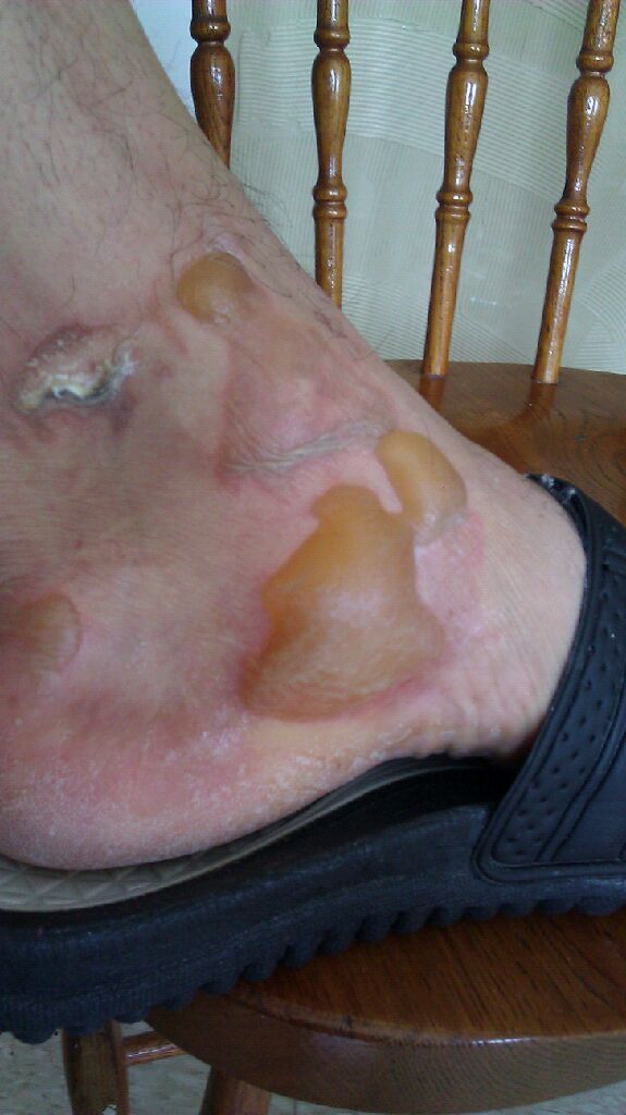 That's a pain that'll linger. Looks like he'll be in the flip flops for a while. I handle all the workers comp claims for our company and I've never seen a burn that blistered up like that. Hopefully it heals up quickly for him.