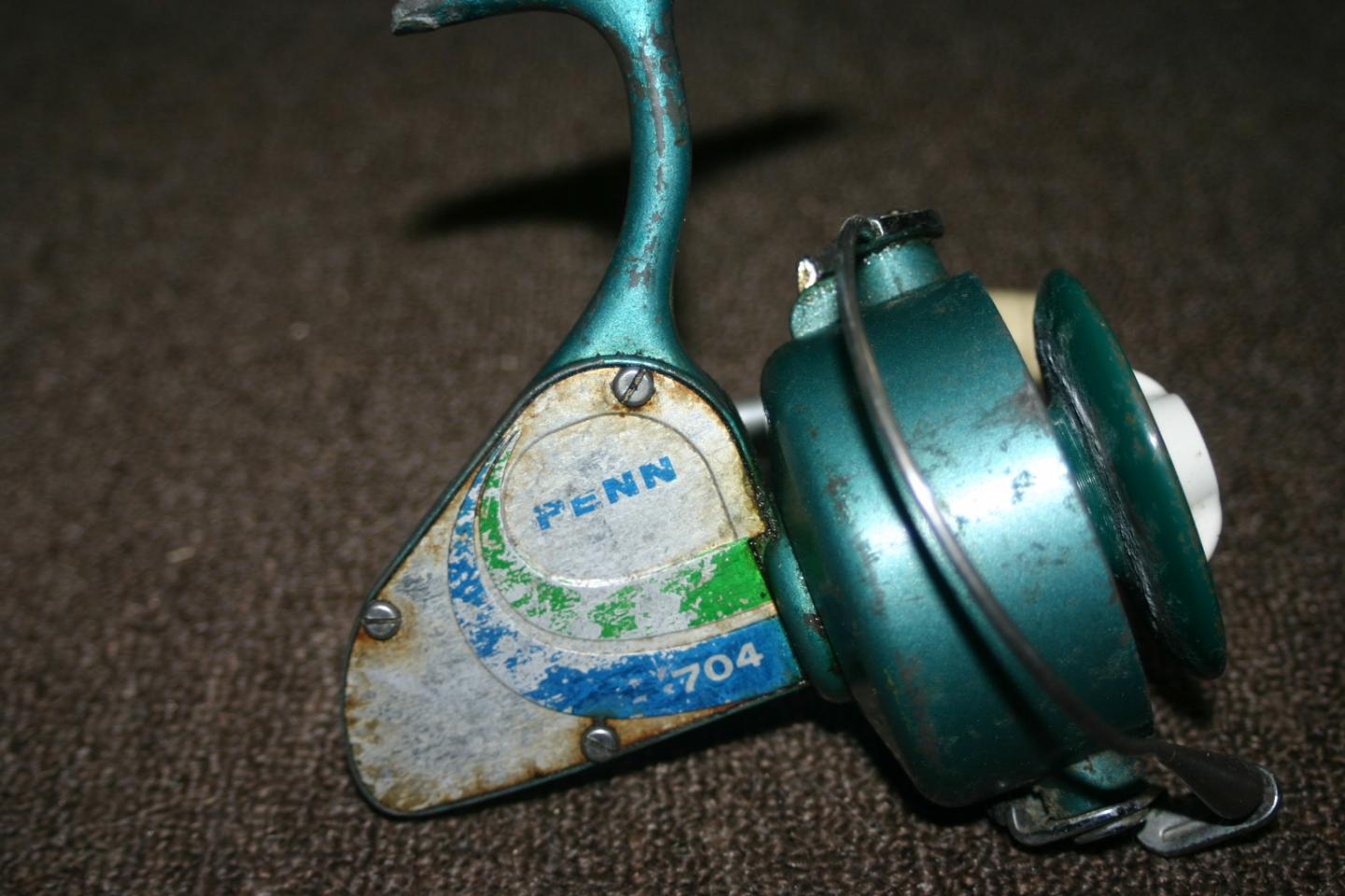 This is an older penn 704. Its in fair condition with some oxidation on the spool and where it sits in the reel seat. Its not a gem but not a basket case either. $15 or a couple plugs will work too.
