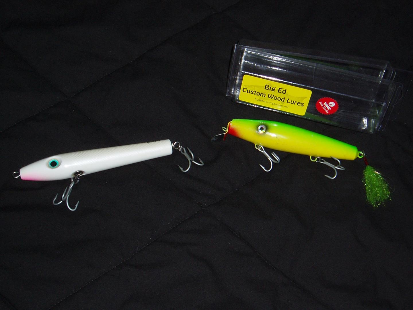 Do either one of these interest you? Both are new never swam, ones a Mike's custom spook white/pearl scale,the other is a parrot Big Ed slopehead..I'm in the middle of making some dannys and pikies, The dannys are old style bm replicas and the pikies are my own design. I could try and get pics of those up? Or I can just send you a money order or paypal $15. It's up to you?