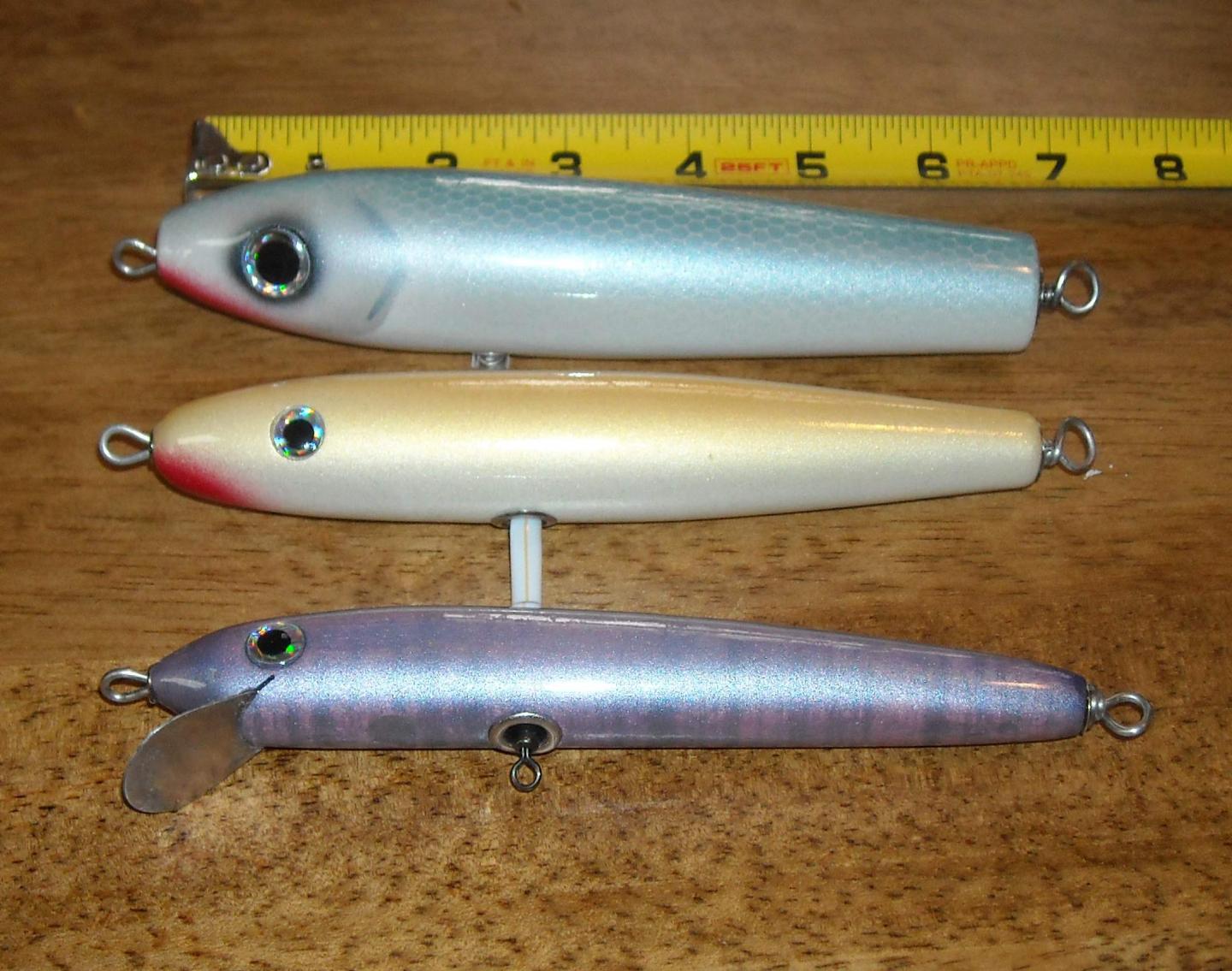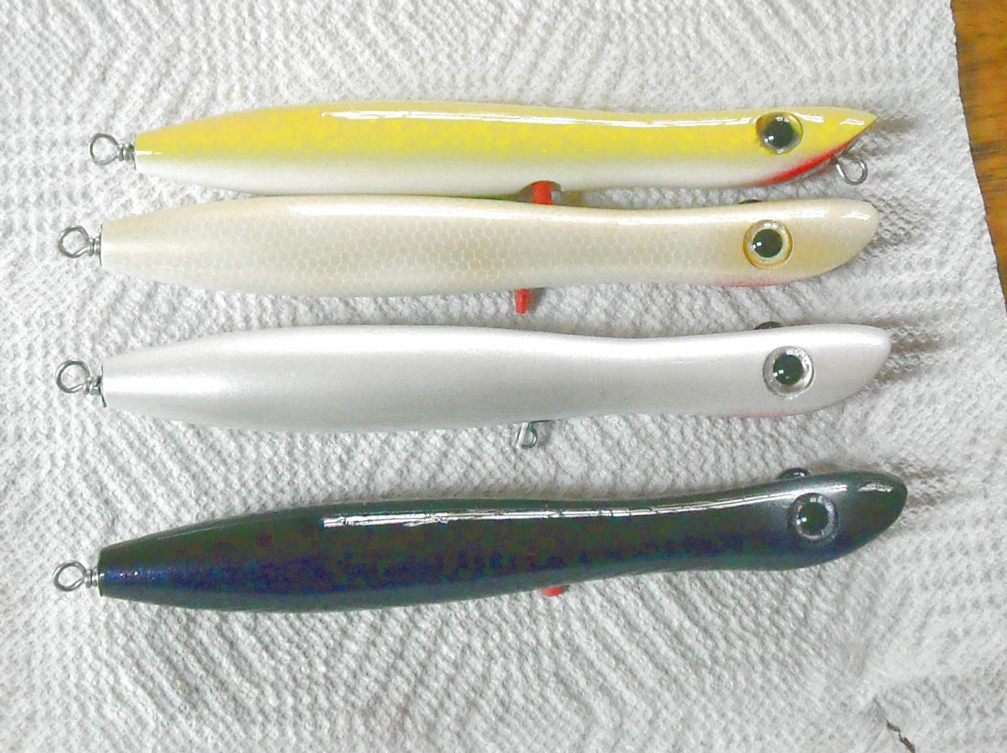 I was talking with PNG at plugfest about a real skinny polaris I'd gotten in a swap and the profile is actually very similar to these pencils. The yellow red head is the original. I was thinking a slim profile might be good if the sea herring or whiting show up again so I made a couple of those to play with too. They are maple and right around 2 oz.