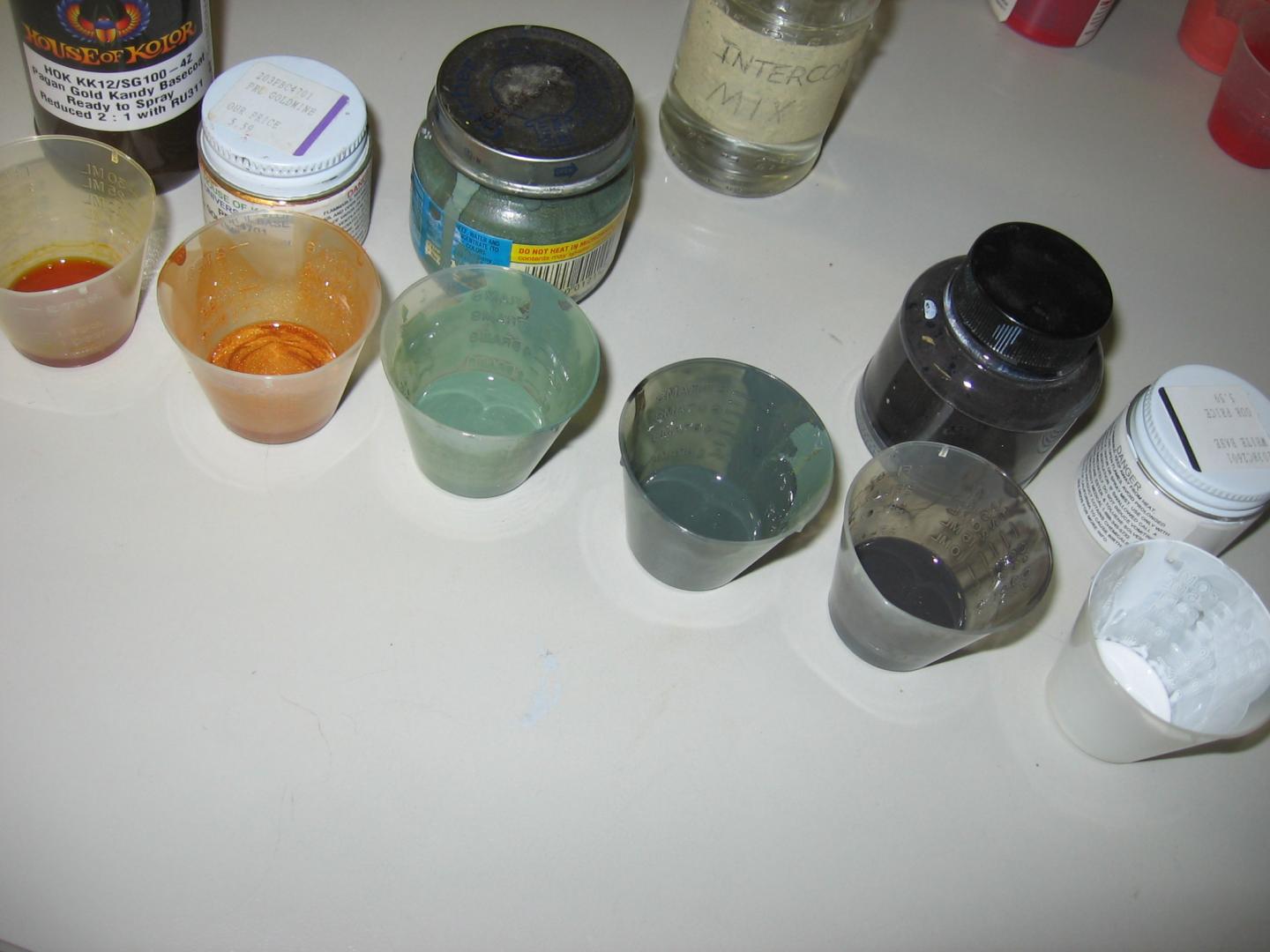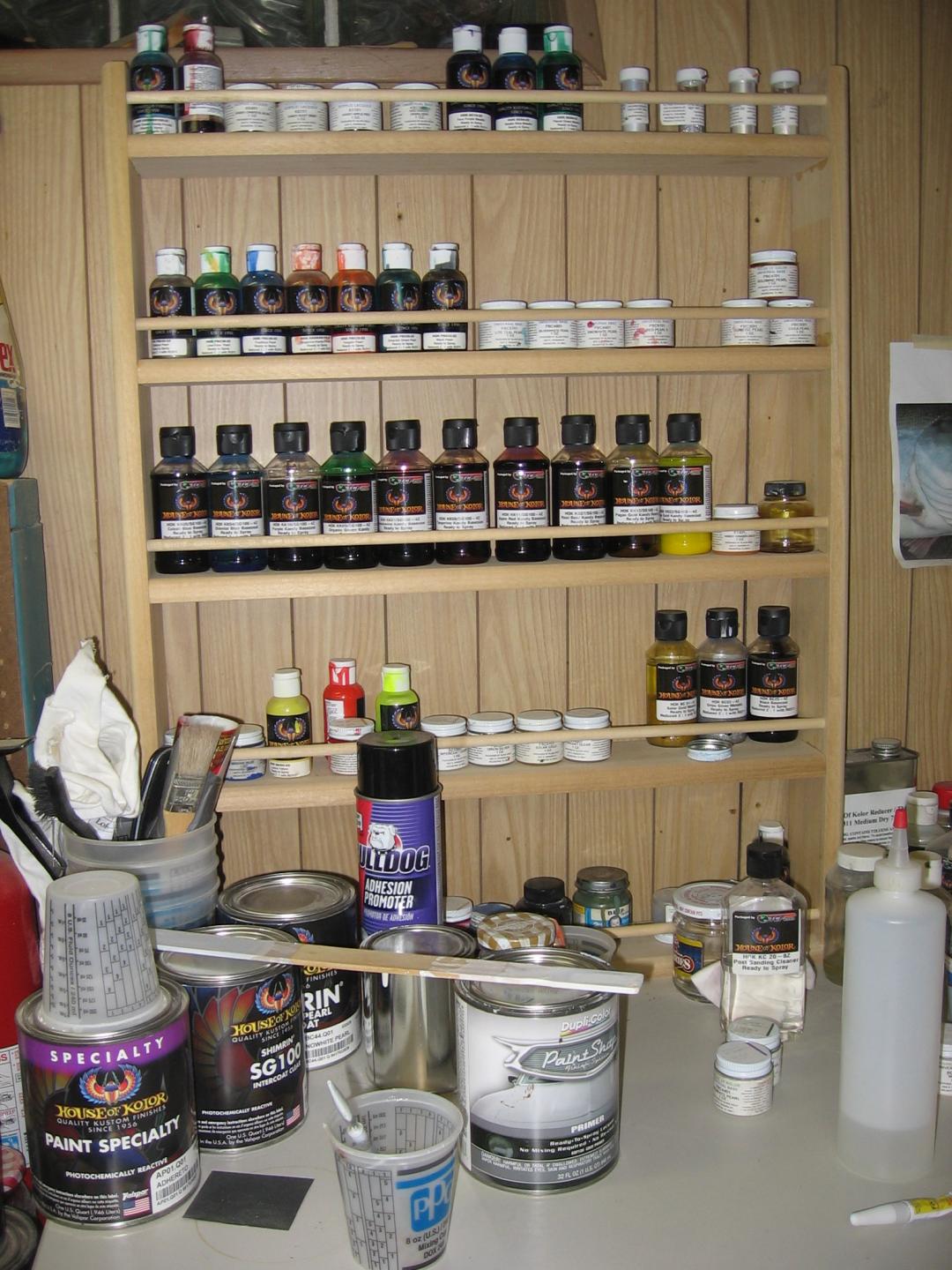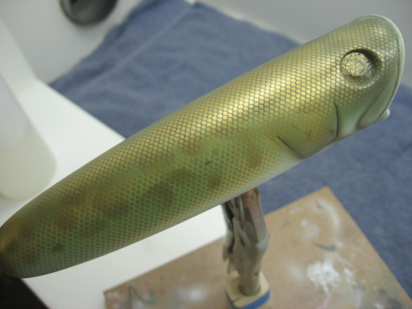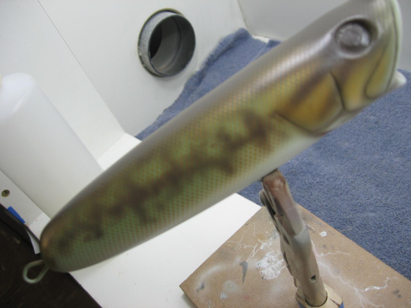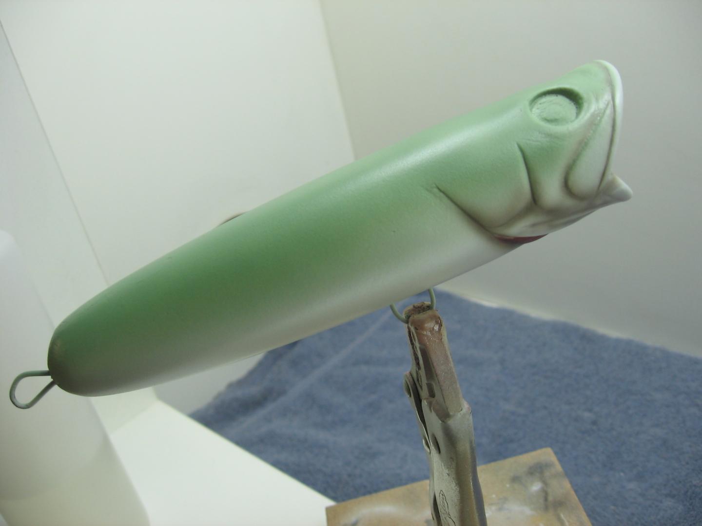 I was painting a few poppers this weekend so I thought I'd take some pics along the way. We all know that the action of a plug is primary and the paint is just an also ran, but I actually enjoy the challenge. First off let me get this out of the way, I use House of Kolor automotive solvent based paints. I have Iwata brushes , and a very well lit outside vented spray booth. Some times I'll use Automotive Urethanes for a top coat and I want to emphasize the importance of a proper booth and respirator. Let's paint. The poppers I was painting are some of my resin plugs I had hanging around for a while. I thought a Largemouth bass pattern would be nice. They were primed with auto primer, painted white base coat then pearl white. I taped off the gill rakers and shot them with pearl red, then just added some thinned grey for shadowing on the rakers and gill plates, that is the first pic. The next one is the mixed paints ready to go. The third picture is the light green on the back and sides as a base for the scales.
