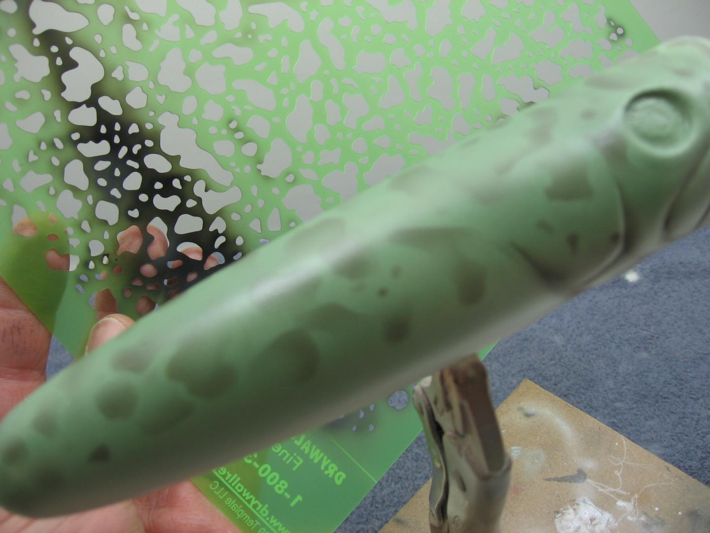 After the scales I used the darker green/grey mix to freehand those side markings ,the back ,and those three typical line markings off the eyes. Then I start with the pectoral fin. For this I cut out a template from cardstock, hold in place, and lightly outline just the top portion with grey. With that template in place I lightly shoot fin rays with the edge of a card. Then lightly shoot some white under the grey followed in this case with some candy yellow. The next pic is the reverse template for the fin drop shadow. Hold this one in place and shoot the bottom starting from the front, tight, and back off as you reach the rear of the fin. All of this paint is heavily thinned, heavily.