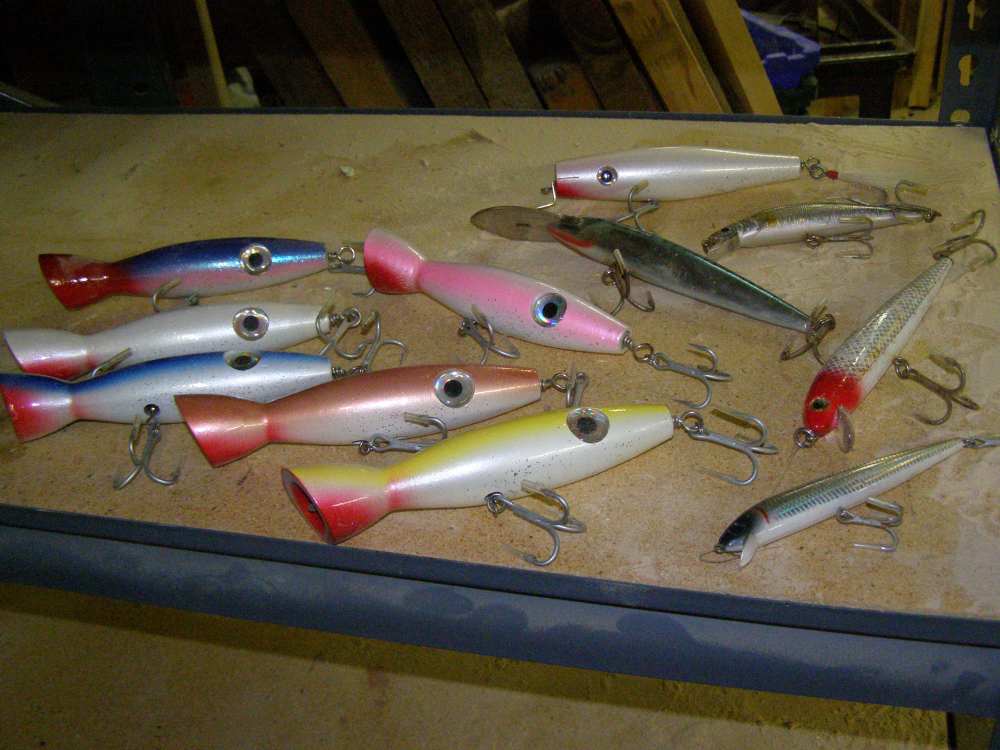 (6) 3 oz fathead poppers, looks like one is a blem. (1) 2.5 oz danny, and a bunch of plastic  Stuff has been hanging in my shop for years. Sick of stuff hanging around.