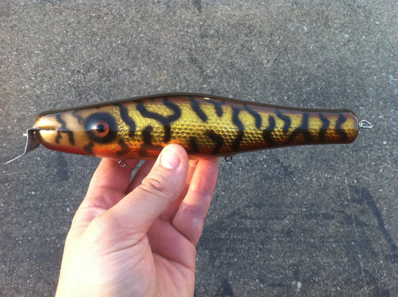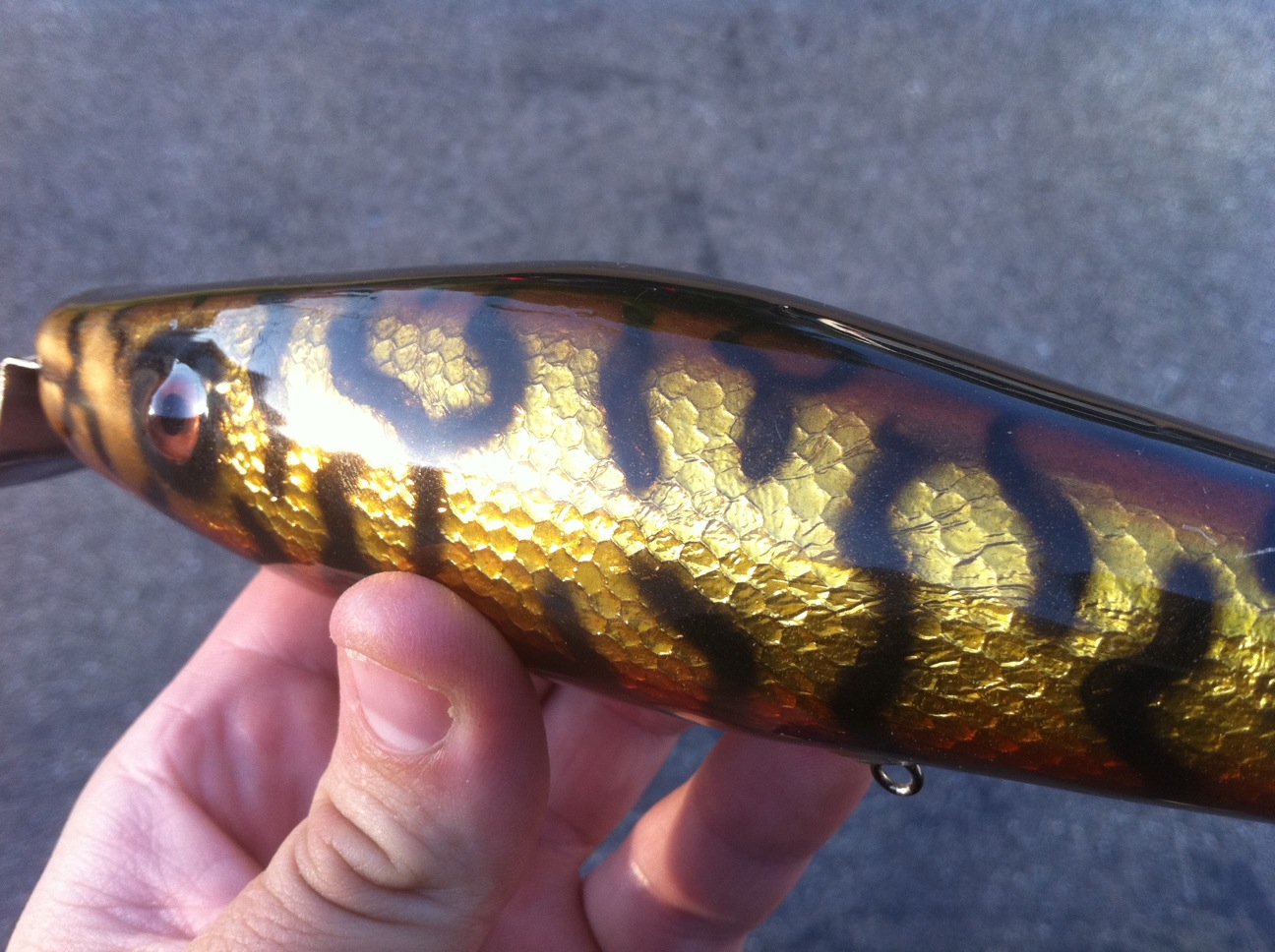 chris doe's it have a pikie lip....if I think right creek chub made a large surfster and very rarely made one with a pikie lip...cool looking plug, alot of work,foil/epoxy/paint/epoxy...wow.....you see more of the pikies with surfster lips....cool seeing copys of rare plugs