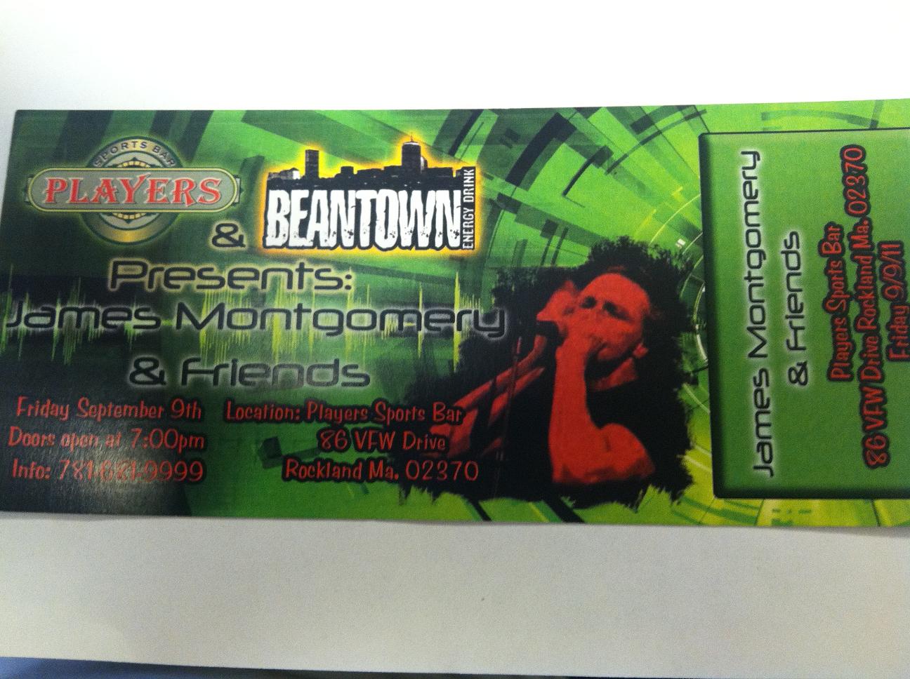 Our drummer has been asked to play in parts of this show with David Hull formerly of Joe Perry Project, Joe Cocker, and Fahrenheit. James Montgomery will be there as the feature but from what I heard today this is going to be a who's who of local legend pop ins. Aerosmith is recording in the area and the comps have been issued to all the people who usually cart those boys around here. Tickets are $20 now until Thursday and $25 day of the show on Friday.