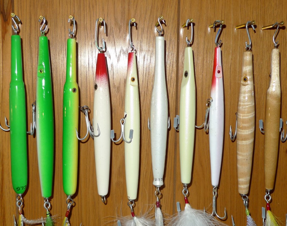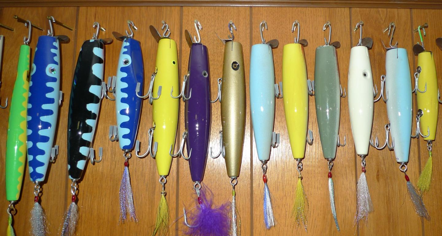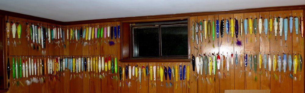 here is my current plug wall inventory and some closeups of the various types of plugs... metal lips (A40s, Surfsters, slopeheads), darters (Musso, Pitchney, Frech), Needles (Musso Wadds, SS 2 sizes, others), Floyd Roman NIKES, dart n'darts, Sizzler), Beachmaster (needles, Dannies, Cowboy & Cowboy JR), Special Canal Pencils......