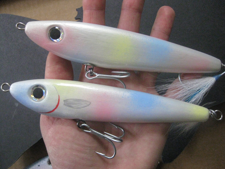Too many things to list... darters in 3 sizes ready for paint... lefty's 6'.. ready for paint... 3 piece eel plugs in R&D stage... flaptails ( not completed from last season ) in need of primer.. some more laminated plugs.. including a 5" darter..lot's of fun.. also bowls...pens and wine stoppers as gifts.. real busy..