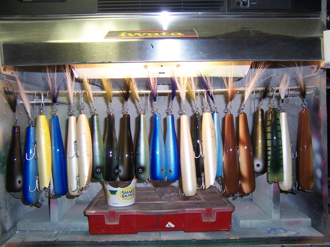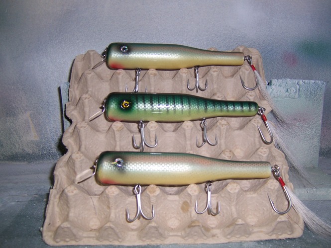 First pictures are of full sized goo-goo's 8" long... through wired.. 3 ounces made from WRC... I actualy turned these last summer as i ran short on supply.. i just got around to putting hooks on these now..... I'll be making more..( one with black body gold scale and white eye shadow for Salty dogs name on it)