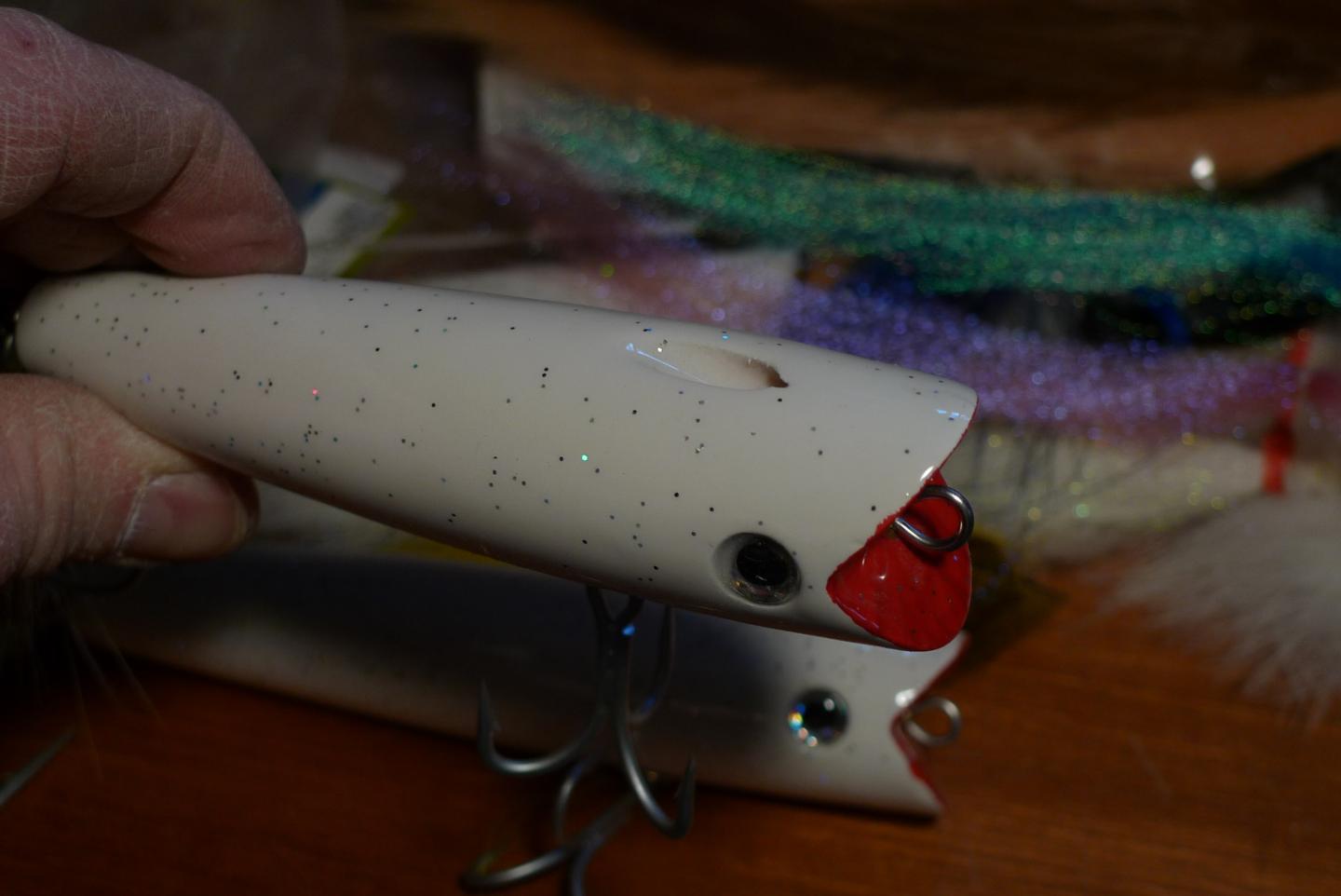 Trying a tapered hole to get venturi effect to squirt water upward on retrieve to drive feeding fish crazy... sealed with 2 Ton and topcoated with 2 ton epoxy... 6x 3/0 belly hooks
