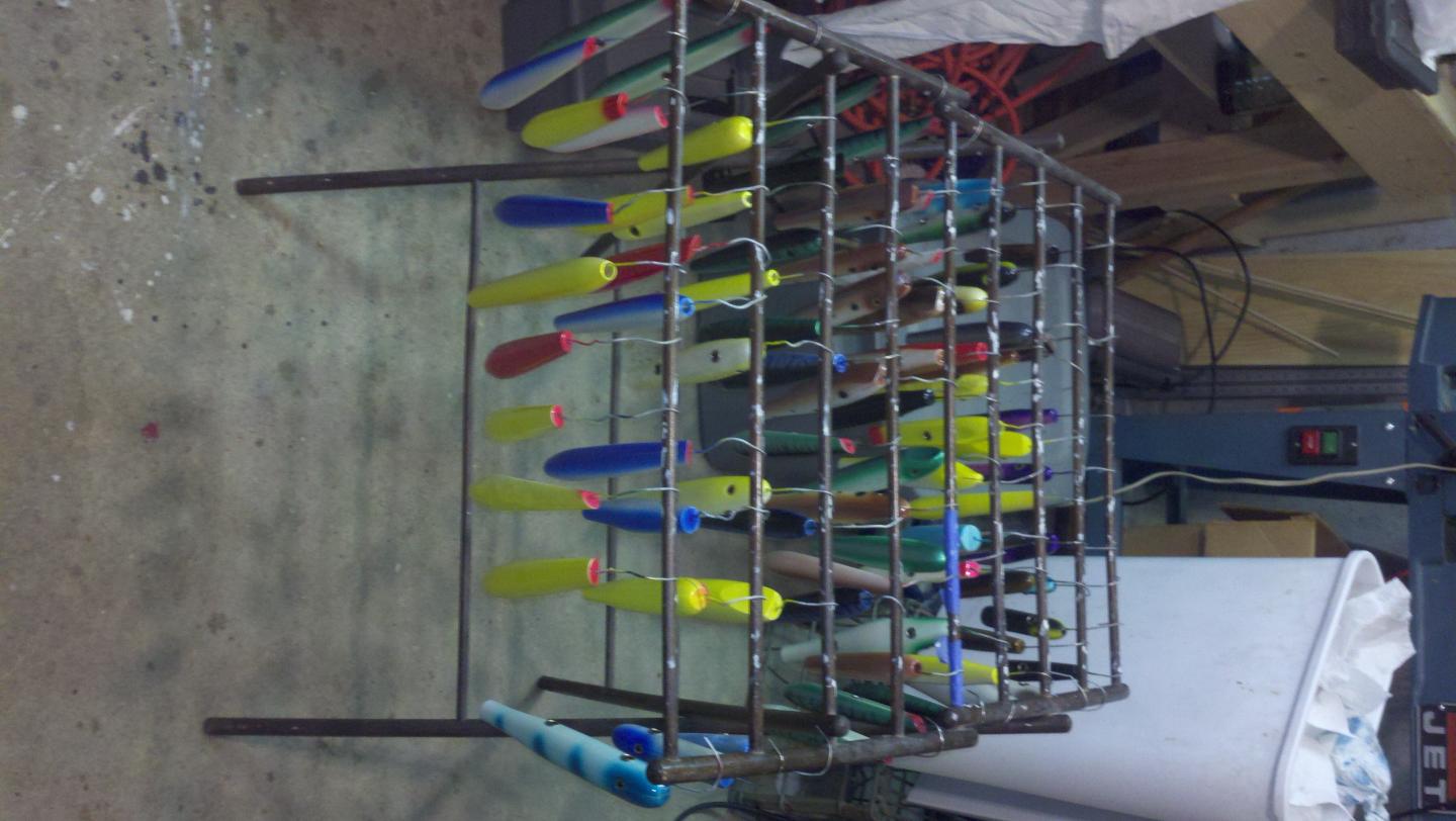 some Saturday before the fish get here.. you should take a ride up to my shop... some of the stuff I've got/made ( some will be on display at plugfest) makes the job go bye alot faster... just my spinner(s) alone can handle 24 plugs at a whack...I can epoxy them almost faster than I can rig them...
