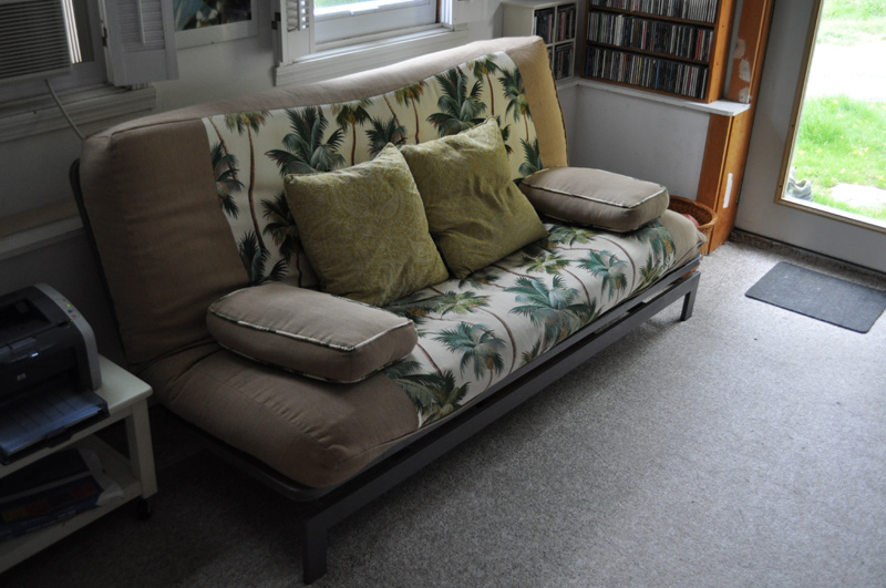 Futon has a metal frame and is decent quality. This won't be available to pick up for a few weeks.