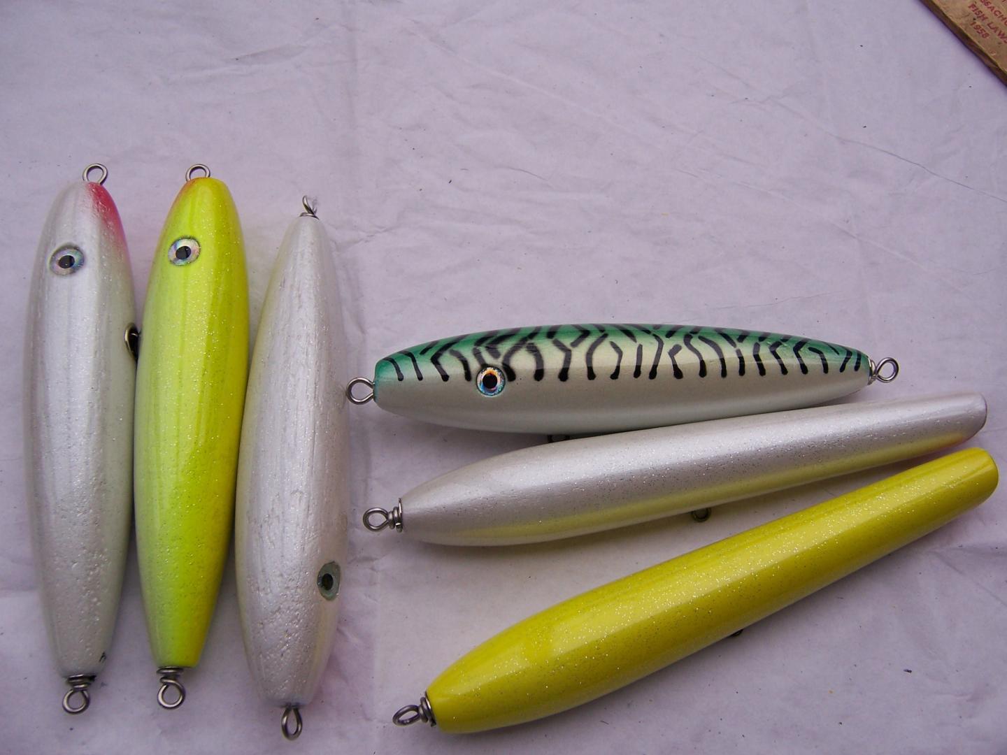 These are my heavy canal poppers. Very small, maybe 5 inch and 2 1/4 oz. A normal size one I make is in upper left corner for size comparison. They cast as good as any I have thrown and pop good too. A very good producer for me last several years. The siwash no exposed tail wgt. ones are much lighter and for boat. They will pop and swim nicely.