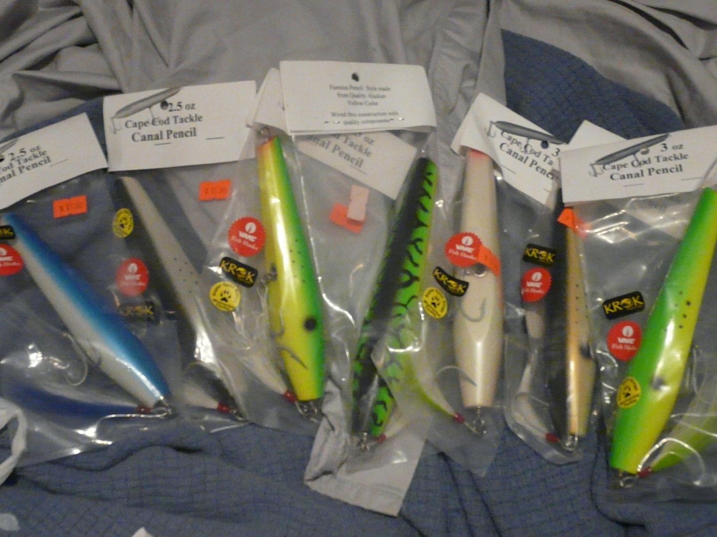why pay this years prices when you buy last years lures at last years prices. have 14 new in the package Cape Cod Tackle pencil as well as regular poppers. $150.00 takes all 14 of them. Just and fyi, already spoke to M&D about these.