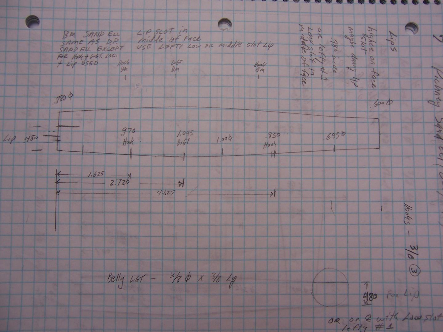 side views and the belly hook location in pencil line, don't mistake the hook swing. Wgt. seems to be in middle of largest dia. part of plug, somewhat forward. Last pic is some I made a few years ago. Also lip on the real Pichney Eely is much wider than others. Lips seem to me to be small lefty style lips in all the others, BM and Pichney's.