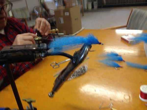 I went a little overboard with my vise. Made it a true rotary vise, used 3/8 rod and some roller blade bearings. The cylinder is a piece of gas pipe, welded a tab and threaded a ¼” screw as a stop to hold the vise in place so you can use two hands to apply material and use a bobbin. The ¼” screw stops on two nuts that are welded on the horizontal piece of 3/8” rod, on the other side of the vise its being held together by a 3/8” drill stop. It was a fun project, it was made just for tying buck tails, but in this picture you can see that it works with flies too.