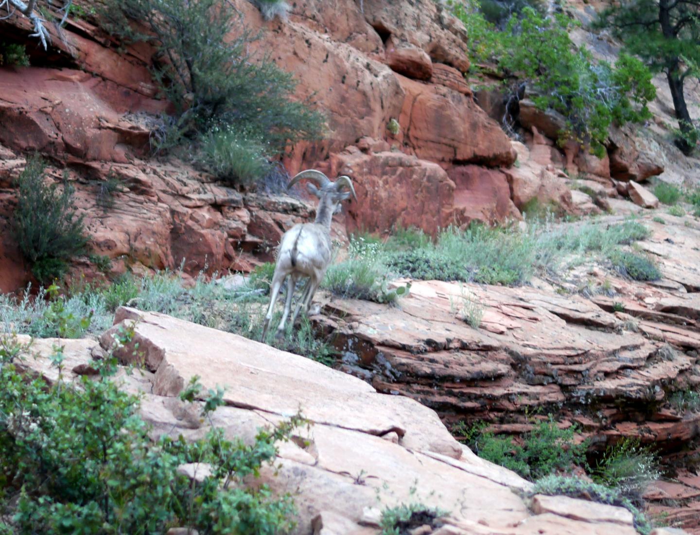 Suddenly he came flying around the bend in the 5 foot wide ledge trail and looked like he was about to head butt Tim. He darted just around Tim by about 6-12 innches and then past me. I was able to snap a few piuctures as he flew by and then lept across a small ledge drop and stopped on the rocks above the trail 30 yds away.
