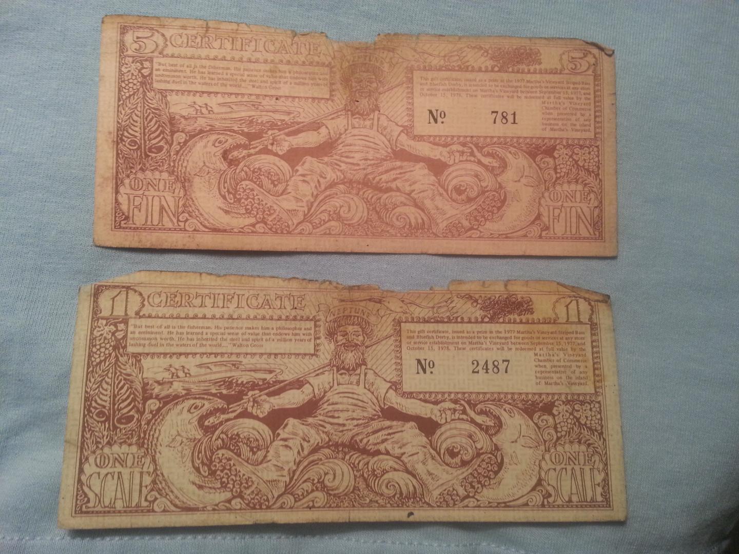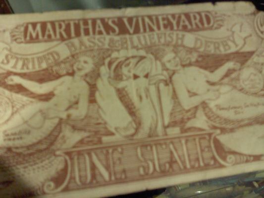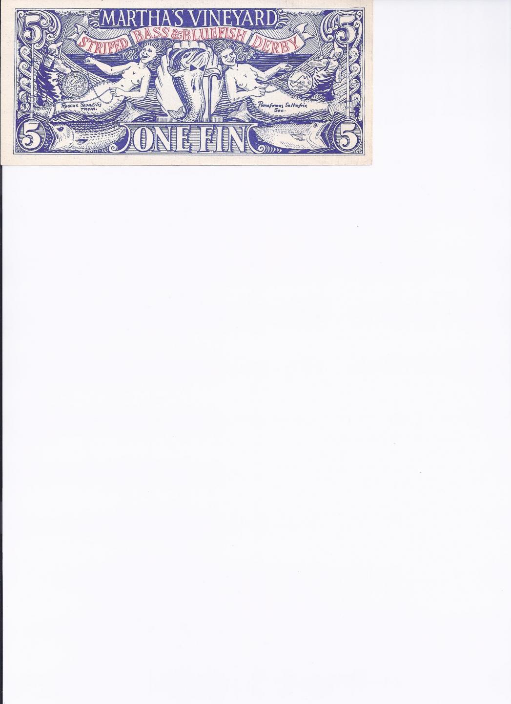 In September of 1986 my wife and I were driving from Oak Bluffs to Edgartown having just driven over the big bridge when she takes an envelope out of her pocketbook and asks me how many "fins" were in her hand. They were my winnings from the year before in the derby that I never bothered to count. I just looked and assumed about $200.00 worth. She started counting, and counting and counting. She stopped at $500.00. Everyone accepted the "fins" then. It sure made my "86" derby a lot nicer. I just scanned some of the last they issued of them on the computor a few days ago. The number on the bill is #25??. Originally called scales and then fins. I kept a bunch of them over the years for keepsake. You were awarded them for daily, weekly, and end of derby prizes. The other big prize I received at the "85" awards ceremony was a free weeks vacation at a cabin in West Tisbury. I only ever got one dirty look using them. It was when I paid the bill in the Navigator for dinner with them. Paid the tip in cash, and that still didn't bring a smile to the guys face, and it was a good tip.