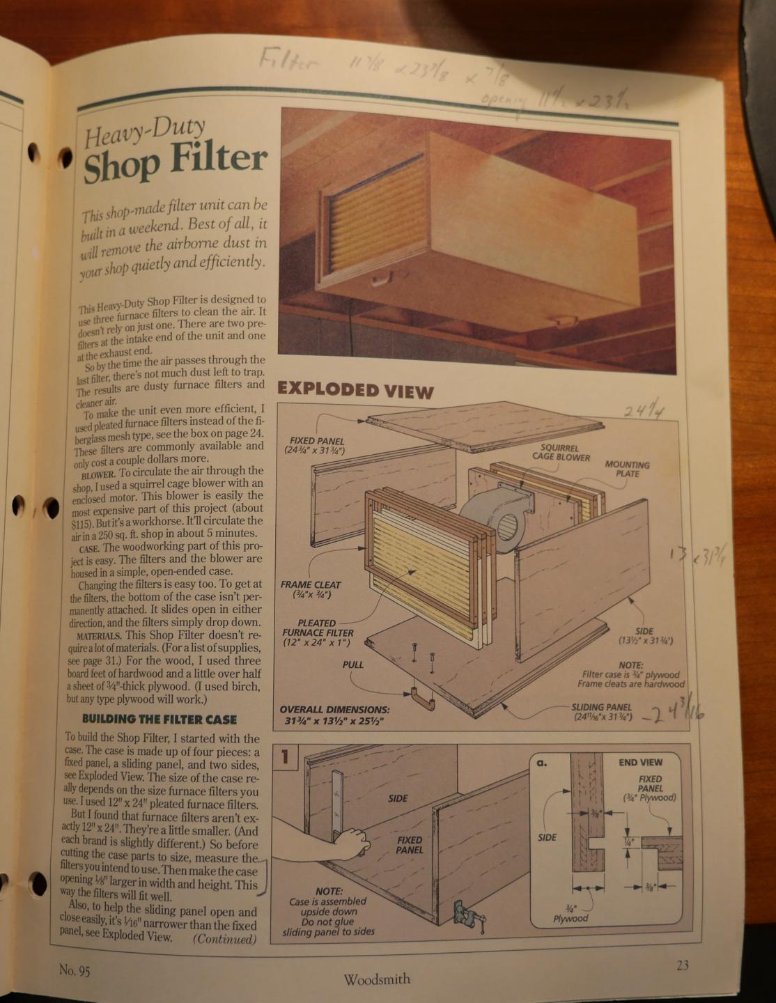 I have recently installed a dust system and exhaust fan in my woodshop so I no longer need this ceiling or wall mounted Shop Filter. This air filter removes airborne dust from your 250 sq foot shop in about 5 minutes. It uses a squirrel cage blower and 3 pleated furnace filters to effectively remove dust that would get into your lungs.