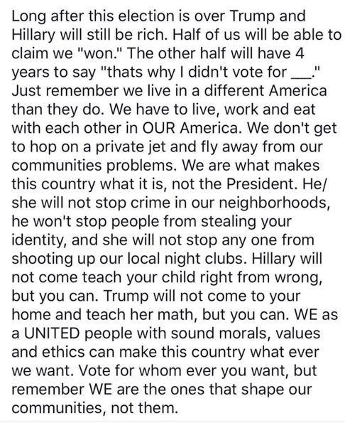 This election is not about whether or not Hillary or Trump will shape our communities. And it is not a personality contest between Hillary or Trump. And portraying it as an argument over which is the most moral or "qualified" is a distraction from what it is more importantly about. Your attached note is partially correct in that WE shape our communities, not Hillary or Trump. But making that distinction distracts us from the fuller distinction, as well as connection, between WE and government.