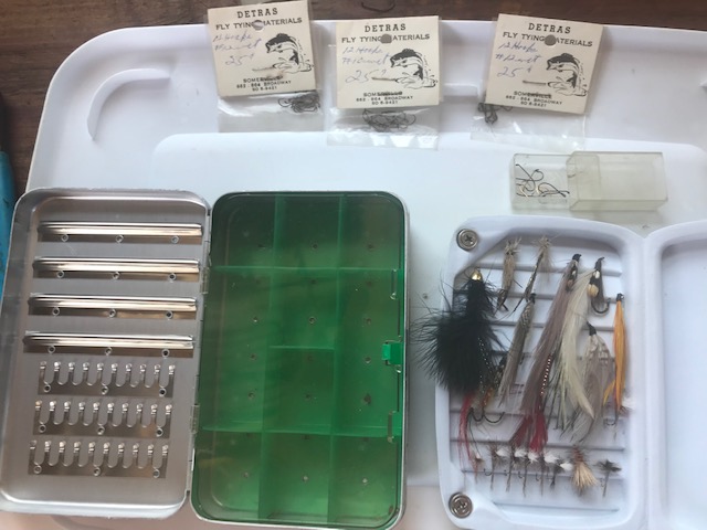 Her day was into heading to Maine to fly fish, so I will probably put these up for sale, now if I only had a clue what they are worth. Includes a couple orvis boxes, 12 dry flies, 11 streamers and packages of #10/#12 hooks.