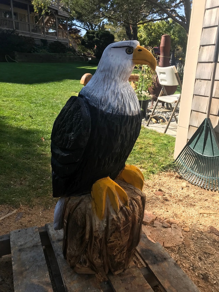 My chainsaw carving skills are getting a tad better and while I've sold a few pieces to friends, I know I've not been getting what I might and certainly not paying for my time. This piece I might not even sell as it's my first attempt at an eagle, well actually my first attempt failed to look the part and became a red tailed hawk. A carving in Lee Mass I've corresponded with has given me some direction on pricing with the basic starting point at $100/ft then adding on if involved or in this case maybe it requires more painting and sealing. Since we have our own craftsman on this site from glass blowers and cabinet makers, to custom plug builders, what do you think about $325 if I decide to sell?