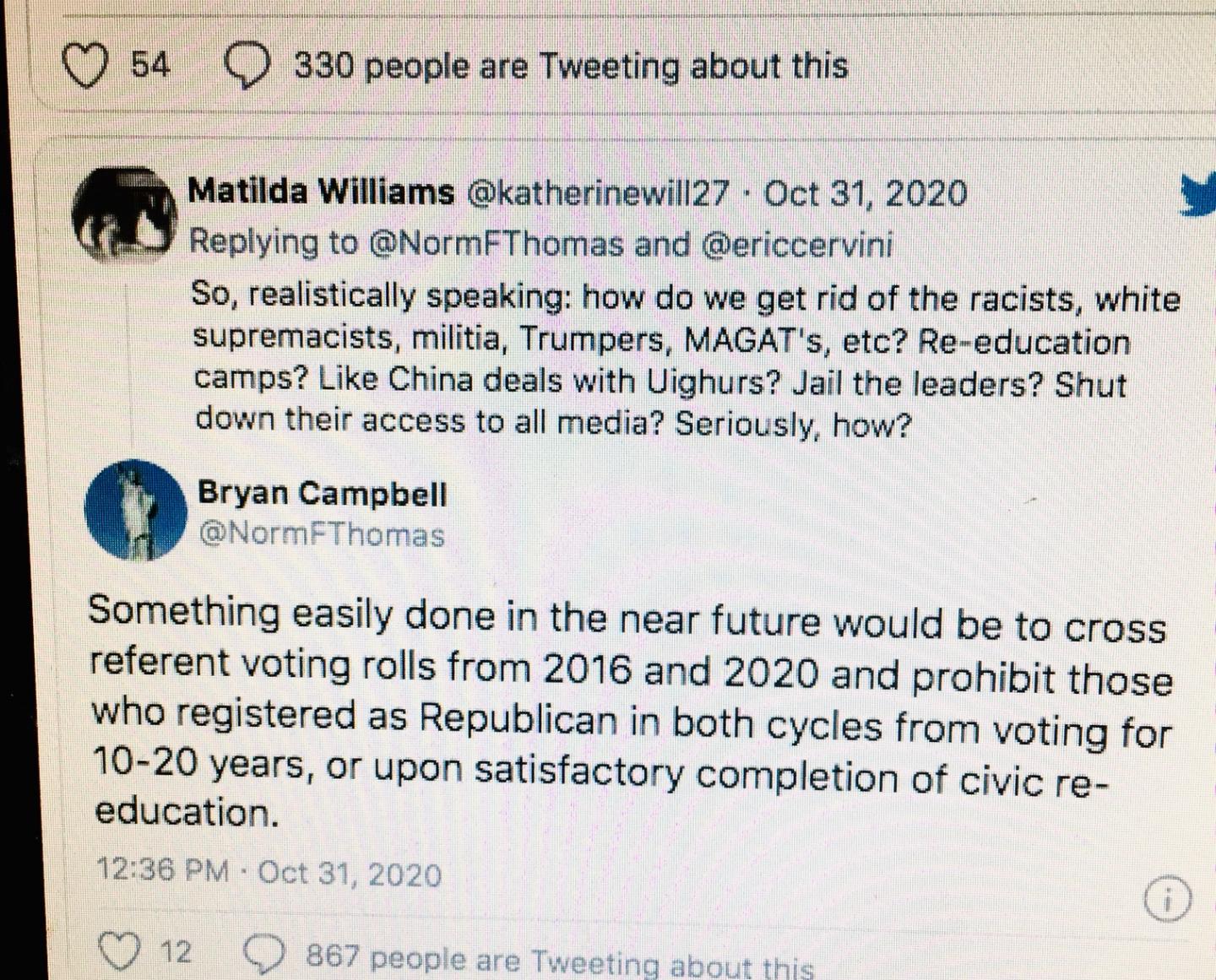 Oooh 300 people tweeting stupid stuff, how enlightening that is thanks for the nothing burger. How about the nut job in the White House becoming so unglued and spouting crazy election fraud theories that every network dropped the coverage save one. When he looses and the courts throw all his BS crap in the trash where it belongs, I suspect a major meltdown is coming.