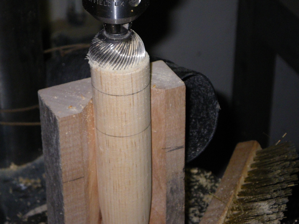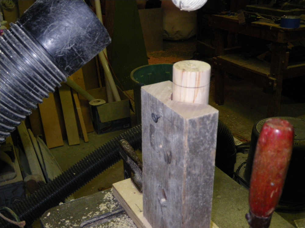 The next step is to cut the face. To do this I use a drill press and a salty ball (rotary rasp). As you cut the face it will generate a lot of downward pressure on the plug and rotary force as well. Holding it in your hand is ill-advised, so I made a jig. Just a board with a vertical V block screwed to it. At the base there is a 1/8" pin that I can set the tail hole on. Take a compass and draw a circle centered on this pin that is the same radius as your plug's at the max diameter ( which is 2x the radius for Back Beach's benefit), then position the walls of your V block against this circle and fasten it down.