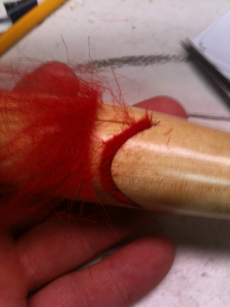 Using a metal lip, push the craft fur into the slot. Let dry and then start to trim.