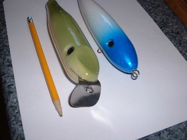 a couple large poppers for my conv out fit...red and white, I was trying to copy a gt bull, wasn't really happy with the copy but if I never seen a gt bull I probly be happy..the gt bull's arn't round they would have to be off center turned...maybe this winter...its ayc and weights 4.3/no hooks....blue and white ayc 3.4 /no hooks... and a pikie/surfster weighting 3.4/no hooks think its mahonagy(not the dence stuff,light) and a red ceder spook 2.4/no hooks...hope everyones out catching fish..I'm smashing down my porch its all rotted