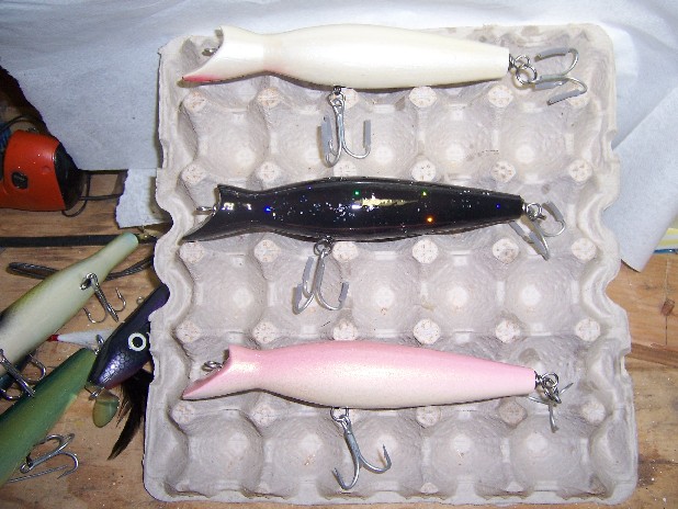 I've been busy for sure, lot's of stuff still "curing" I'll be painting all this week.. I've got three sizes of needles, three sizes of pikies and surfsters, 40's and eel skin Jr. as well as some "tricked up" Copies of Capt'n Bills swimmers all to be finished...