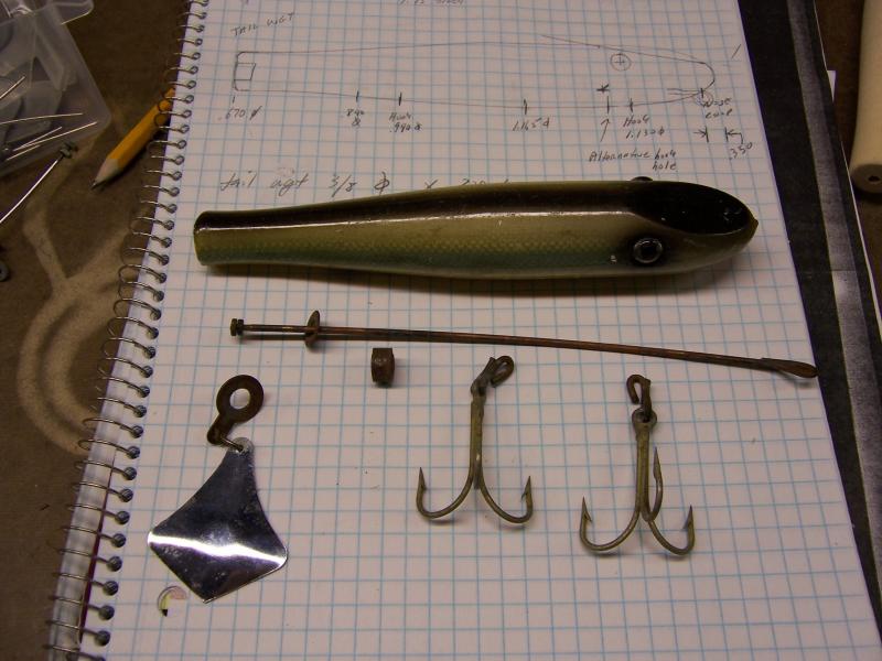 #1 Here is the original hardware. It is all brass with neat hangers and threaded brass end. That is the tail weight there in the picture. It was just a piece of steel not lead 3/8 dia by 1/4 " long. That is the only weight in the whole plug.