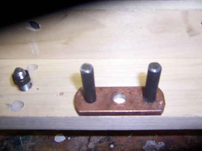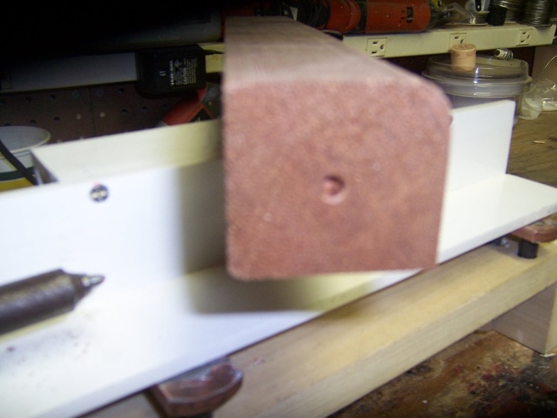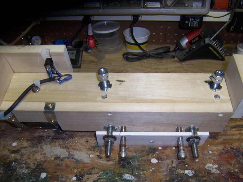 Teh motor is a 1/25th HP mixer motor that turns at 1725RPM's.. it is held in posistion by a pair of universal strap hangers.. the main body is 3" X 3/3 poplar .. the "bed" is made from two lengths of PVC angle that is drilled and tapped to allow them to be back to back... the bed rests on a pait of F&M plates, used to affix copper pipe to the wall, the center hole( which is normaly threaded) is drilled out so a 3/8 16 theaded rod can ve set flush on it.. the two side "mounting" holes are drilled and tapped 3/8-16 and a pair of 3" long sholder bolts threaded ( and loc tighted in place) the heads and excess is removed... in the bed, I mounted a pair of kep nuts ( on the reverse side for clearence) and epoxied them in place, these are the adjustments for the bed... I did the same in the back side... the angle on the back side is drilled 3/8 -16 and a pair of adjusting bolts threaded in, keep theses low or the bed wont sit flat ( see the empty holes above the ones with bolts) a paitr of studs atre threaded into the back side of the platform and the bed slotted for adjustment...