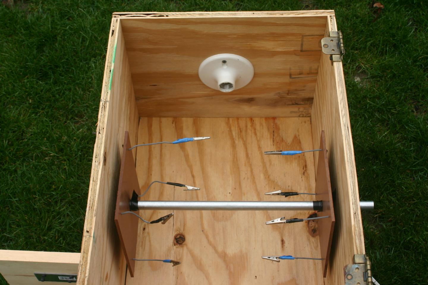 This is a plug spinner I made a few years ago. Its a plywood box with a piece of conduit pipe going through it and some aligator clips to hold the plugs. I used a rod turning motor to spin the rod. It also has a light fixture in it.