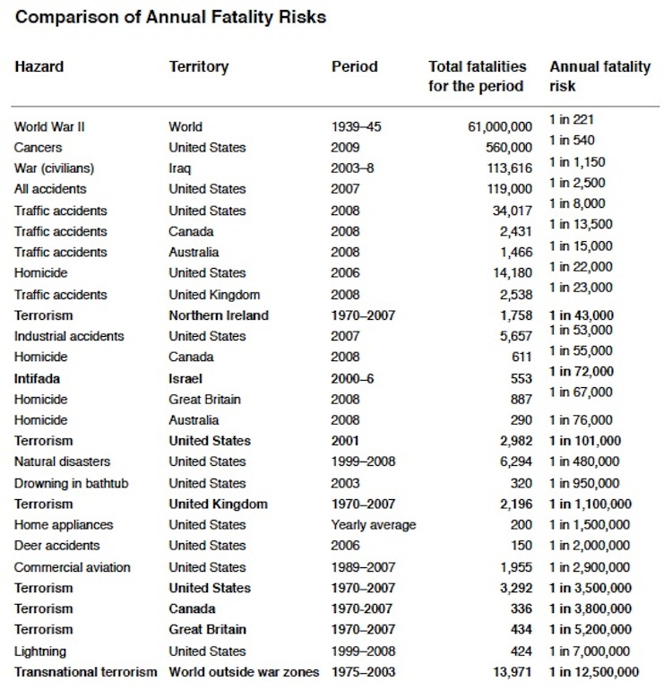 “Since 9/11, foreign-inspired terrorism has claimed about two dozen lives in the United States. (Meanwhile, more than 100,000 have been killed in gun homicides and more than 400,000 in motor-vehicle accidents.) “