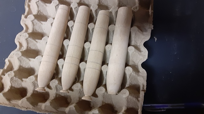 what I have there are some 1.5 ounce needles and slim swimmers, those are all made from WRC … there are 4 darter blanks there for Pinkney style 3 ounce darters, I make mine out of Ash these days, I like it better than maple, it's just a tad more stable...also pictured are some goo goo eyes,made from AYC, sealed with Tung oil,paint is createx with E-tex outer shell.. the Conrads are made from Mahogany, sealed and painted like above... also there are a few pikies there.. those are spun from WRC..finished like he rest.